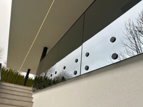 Točkovna pritrditev: Steklo je pritrjeno neposredno na rob betonske plošče s posebnimi točkovnimi nosilci (distančniki) iz nerjavnega jekla. Ti nosilci prenesejo točkovne sile. Ta rešitev je izjemno elegantna, saj je steklo skoraj “plavajoče”.